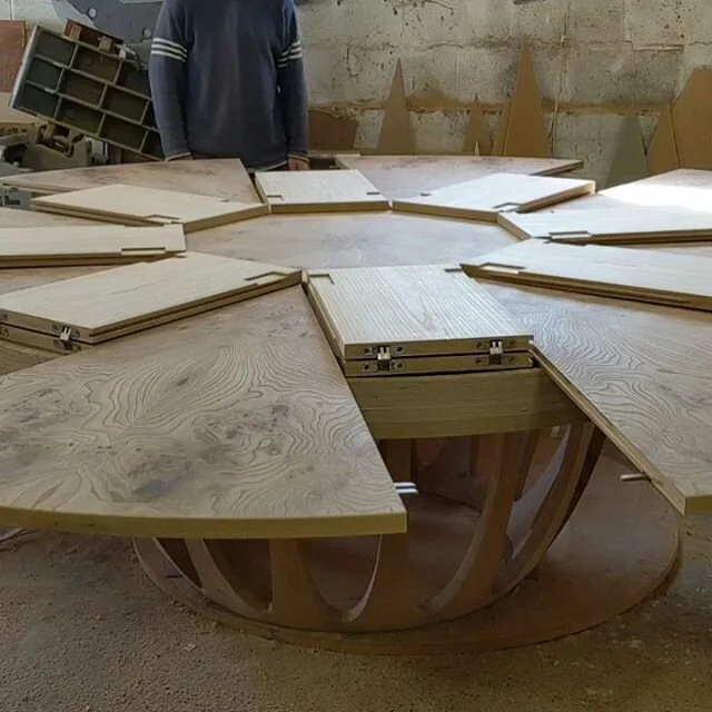 Expanding Dining Table in Brown Oak Burr showing six lines of symmetry